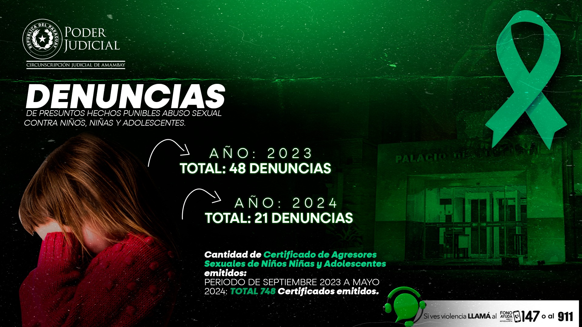 En el marco del “Día Nacional de Contra el Abuso y Explotación Sexual en Niños y Adolescentes del Paraguay”, que se conmemora el 31 de mayo, la Circunscripción Judicial de Amambay, se adhiere a la campaña impulsada por el Ministerio de la Niñez y la Adolescencia (MINNA), bajo el lema “MÁS LE HABLÁS Y ESCUCHÁS, MÁS LES CUIDÁS”, con la iluminación de la fachada del Palacio de Justicia de Pedro Juan Caballero de verde. Igualmente, se muestra una estadística de las denuncias de presuntos hechos punibles de abuso sexual contra niños, niñas y adolescentes registradas en el Poder Judicial de Pedro Juan Caballero. Es fundamental denunciar cualquier sospecha o conocimiento de abuso. ¡Protejamos a nuestros niños y adolescentes!